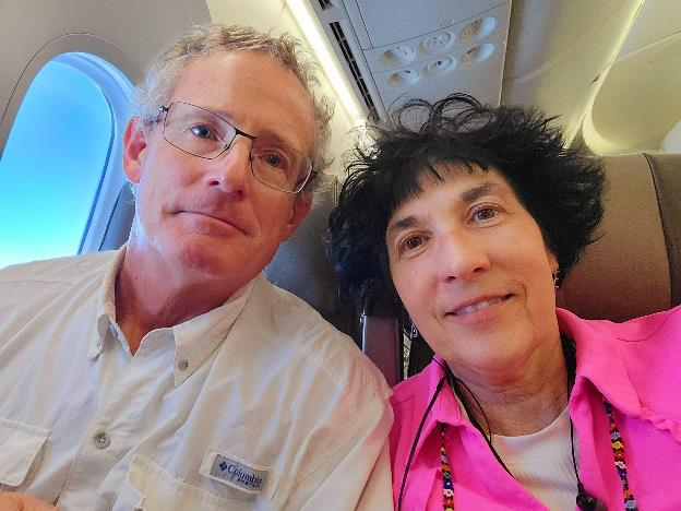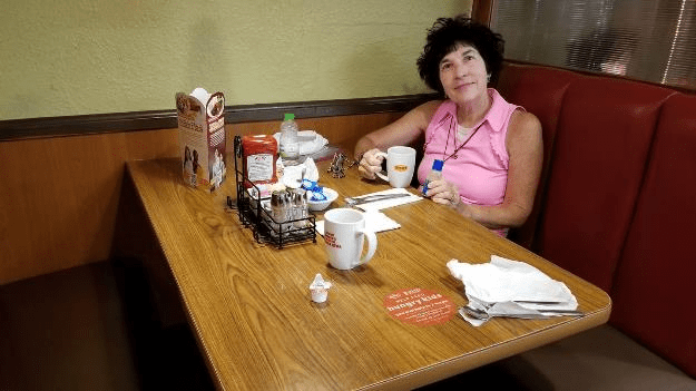 We were wide awake at 4AM this morning so we took our time getting up and getting ready to travel. At 6AM we went to a nearby Denny’s for an American breakfast and plenty of coffee. Patti was looking chipper in the booth there. I wasn’t feeling so chipper.