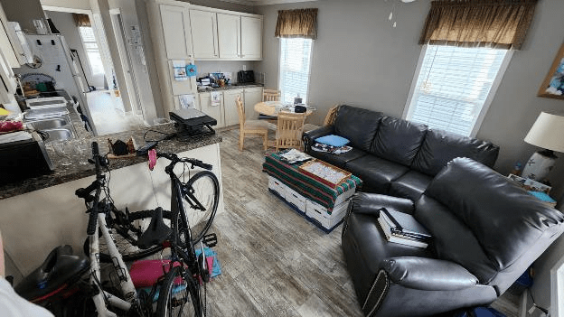 We’ll be staying in this one-bedroom one-bath manufactured home for two months. We’re in the Horseshoe Cove RV Park in Bradenton. The driveway is big enough for two cars.