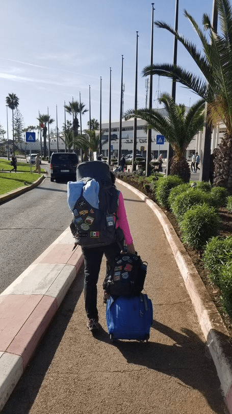 We were up early in Casablanca and packed up. Here’s our luggage relaxing on the sofa. We each carry a 70 and a 25-liter backpack. Our 70-liter backpacks are in the middle in this picture and our 25-liters are on the outside. Patti also pulls a small blue carryon bag which is on the floor here.