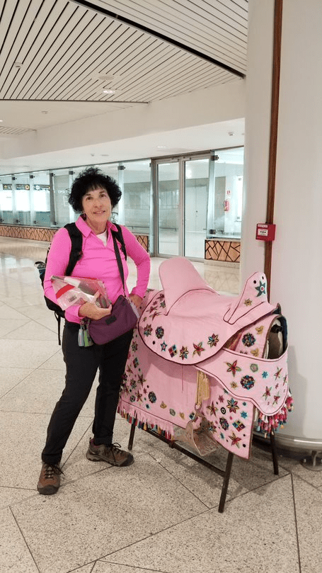 We went through a security checkpoint upon entering the building, which was unusual. All our luggage went through the baggage scanner and we went through the people scanner. Then we went to the check in counter but we were a little early so we waited about 15 minutes to check our bags and get our boarding passes. The next checkpoint was a ticket scan which we were also too early for. So we waited 30 minutes at a café then tried again and got through. Then we got to the security area and it was similar to all other airport security areas and we got through without unusual attention. Then after putting our shoes and belts back on we went through the Duty Free area where Patti bought a big bottle of Bailey’s Irish Cream, which she puts in her coffee every morning. Then it was on to the concourse where Patti found a pink saddle that she liked.