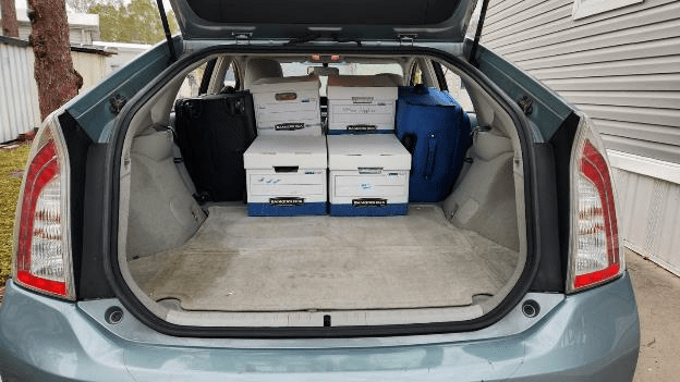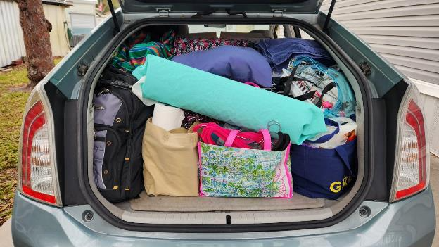 We were already mostly packed up for our short 40-minute trip to St. Petersburg, but we were up early anyway this morning and loaded the car. I’m trying a new packing method today, we’ve each got our large new suitcases that we bought for our 4-month trip around the Caribbean, mine is black and Patti’s is blue. We’ve also got 6 document boxes which fit pretty well into the Prius’ form factor and leave space at the back for the less modular bags and boxes.