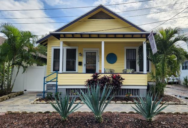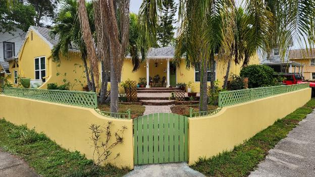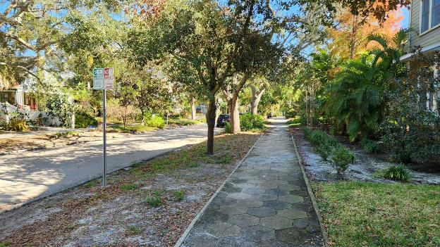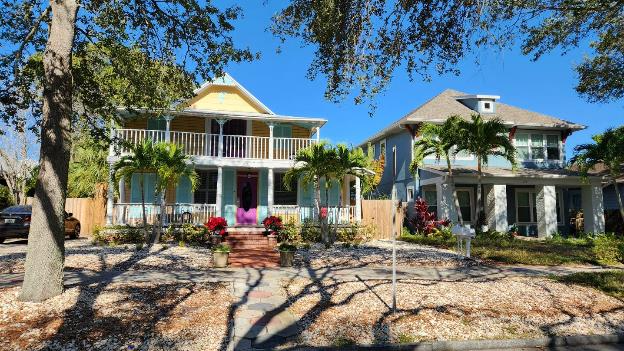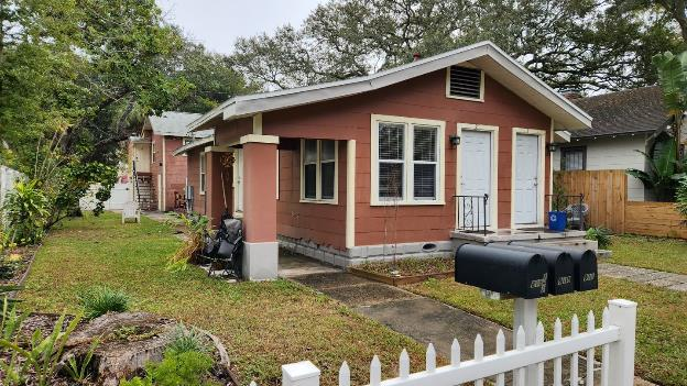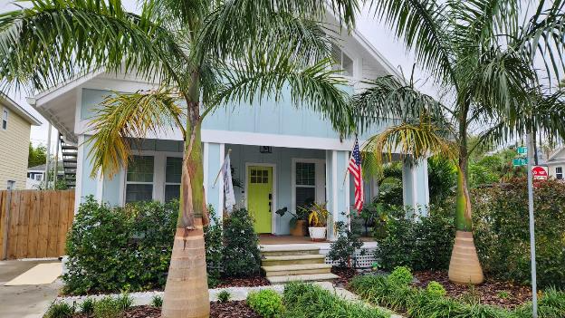 Our new Airbnb is a one-bedroom apartment on a quiet street in an old neighborhood of St. Pete. From the street we walk back along the sidewalk to the rear building and our apartment is on the ground floor.