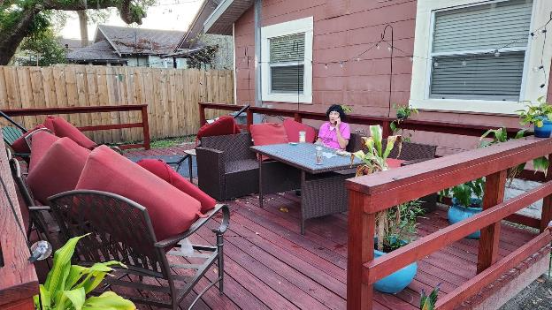When we got home we drove up to Publix grocery for some provisions then had a happy hour on our deck. Here’s Patti on the phone on the deck.
