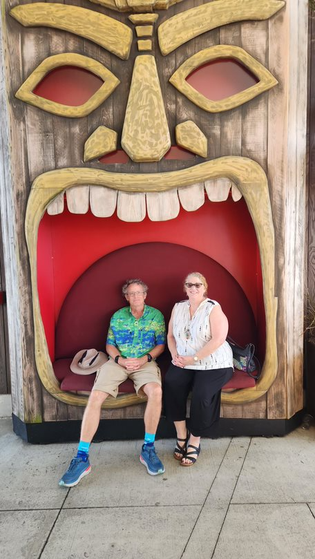 After that my sister came by for a meeting with Scott then she and I went over to the pier for happy hour. We got our picture taken with the big Tiki god.