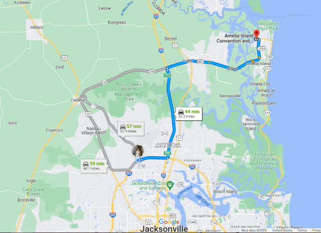 “Amelia Island is a part of the Sea Islands chain that stretches along the East Coast of the United States from South Carolina to Florida; it is the southernmost of the Sea Islands, and the northernmost of the barrier islands on Florida’s Atlantic coast.[1] Lying in Nassau County, Florida, it is 13 miles (21 km) long and approximately 4 miles (6.4 km) wide at its widest point. The communities of Fernandina Beach, Amelia City, and American Beach are located on the island.”