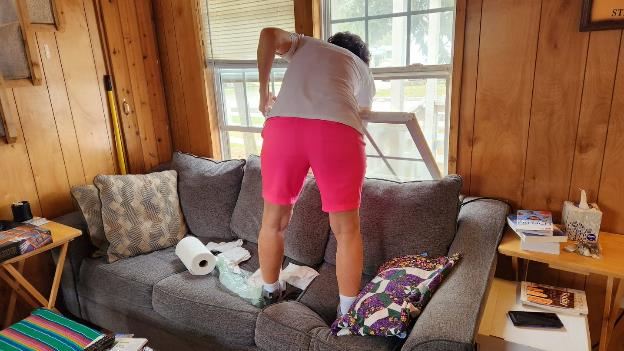Since we’ll be here for 3 months Patti has been doing a lot of what I like to call “feathering her nest”. She’s bought a lot of things to make herself more comfortable here such as cleaning supplies and we’ve acquired some cardboard boxes she can use for organizers. She asked the park for two chairs and she made a long list of items that are broken or need some maintenance. The maintenance guys spent a few hours one day replacing the ceiling fan, some of the window blinds, and the bathroom faucet. Patti has also done a lot of cleaning. Here she is cleaning the outside of the living room window.