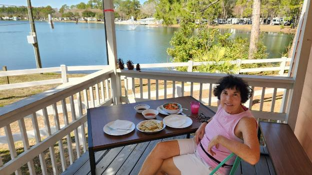 This is a pleasant place, there are about 400 lots and we’ve heard that over 100 people live here full-time in their RVs. When the weather is nice we eat lunch on the front porch.