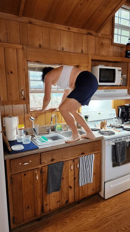 And here she was cleaning the inside of the kitchen window frame. She has a lot of energy for cleaning and is quite limber for an old broad.