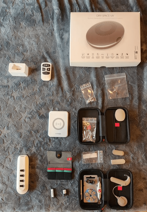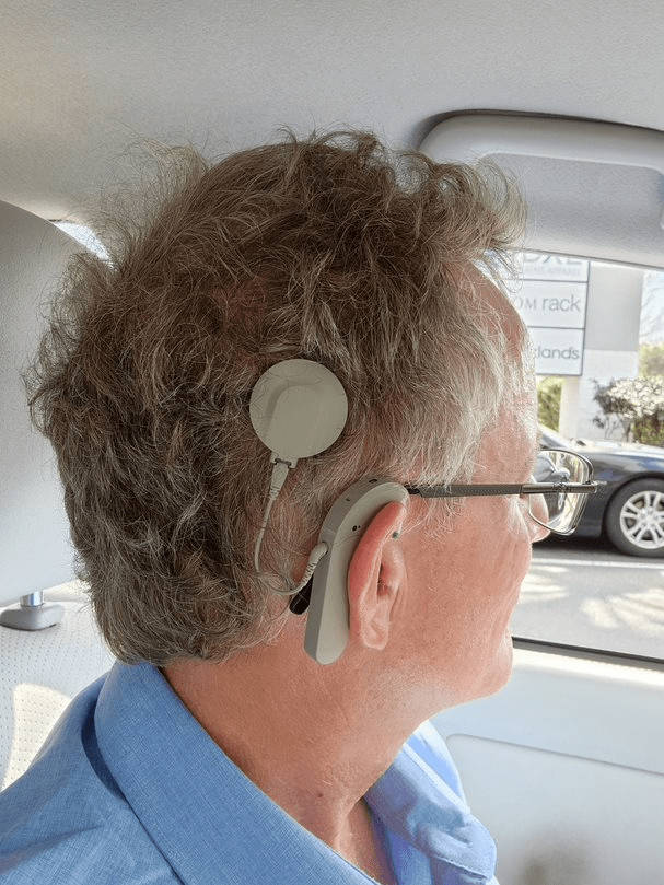 Here you can see the sound processor, with its round coil stuck to the magnet under my scalp in the implant.