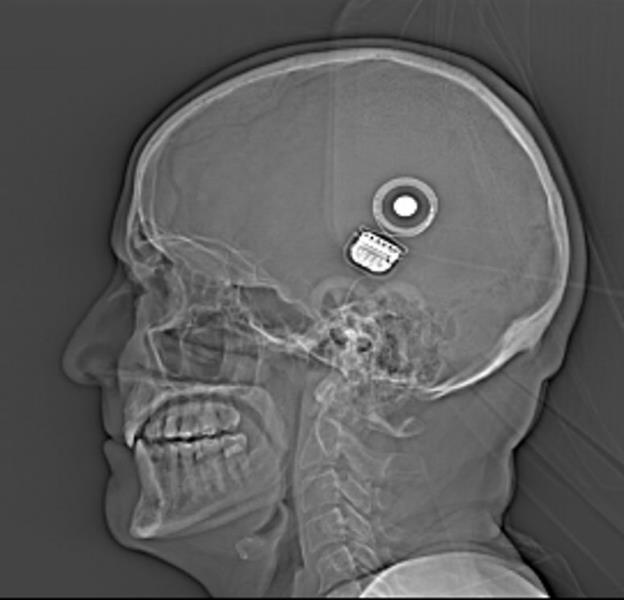 Here’s the CT scan showing the implant on the side of my head. The smaller, very white round spot is the magnet, to which the external coil is attracted.