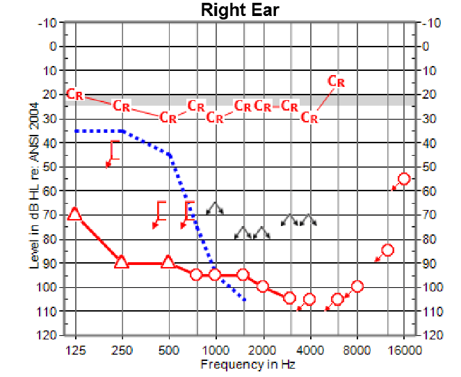 The blue line is where my hearing used to be. The red line with triangles and circles is where it is now. You can see that I’ve lost all my natural hearing in my right ear, as a result of the surgery. That often happens and I was prepared for it, but I was a little sad about it. The red line with “CR” is my new hearing with the cochlear implant. What you can see is that now I have a relatively normal hearing response at 20 to 30 decibels across the entire range of frequencies from 125 to 6500 Hertz.