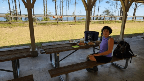 At lunchtime we found an empty picnic pavilion with a view of the river and had a pleasant repast. Patti made a batch of chicken salad yesterday which we ate with chips and an apple today.