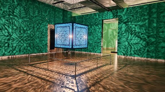 This was an interesting room. The big cut metal cube was hanging in the middle of the room and it had two bright lights inside. Shadows were cast on the walls. It reminded us of the metal lamps that we saw in Morocco that were smaller versions of this.