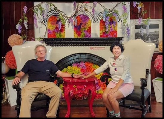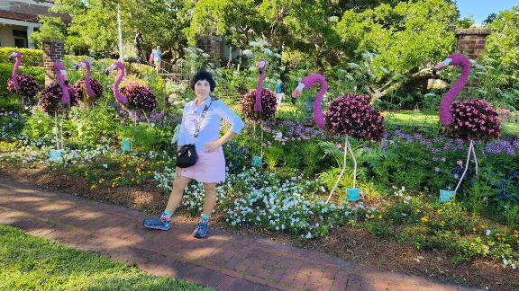 Here’s Patti in the garden with a few flowery flamingos.