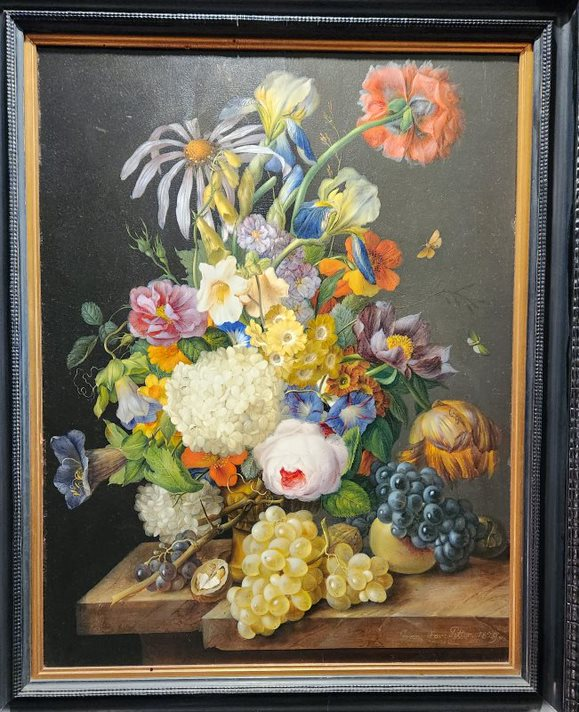 I enjoyed the paintings, I thought this still life with flowers and fruit was pretty.