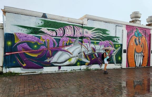The weather has been rainy here so far but today we put on our hiking boots, unfurled our umbrellas, and headed out into our wet neighborhood. One of the things we saw were a lot of pretty wall murals. Here’s Patti with one, in her hiking boots and with her umbrella.