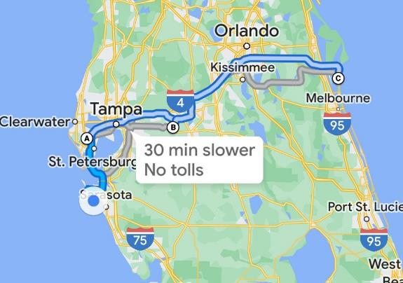 We were up early and managed to cram all our stuff into the Prius again. The poor car was overloaded and down by the stern, but it performed admirably today. On the map below we started at point C, just north of Melbourne. We stopped at my brother’s house in Mulberry (point B), and at our UPS Mailbox in Pinellas Park (point A), and finally made it to Longboat Key on the west coast.