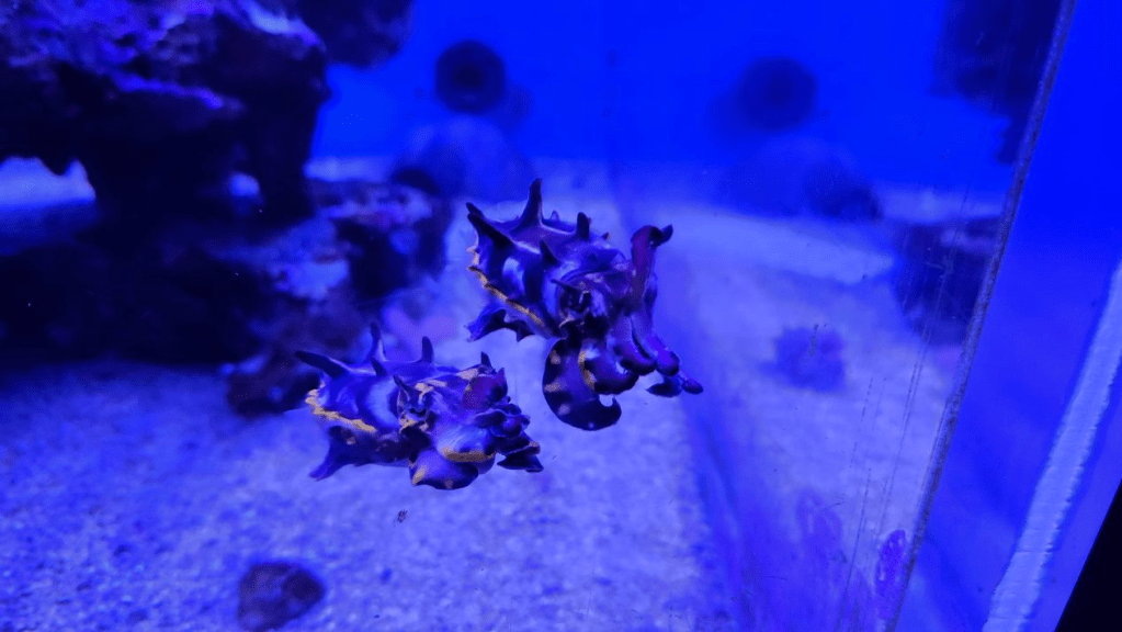 Since 2018 I’ve been volunteering at Mote Marine Aquarium as a guide in the Fish & Invertebrates building on Sunday afternoons, when we’ve been in town. Now we’re just 5 miles away and I can ride my bike there again. I enjoyed my shift and these Flamboyant Cuttlefish were new residents since I was last there.