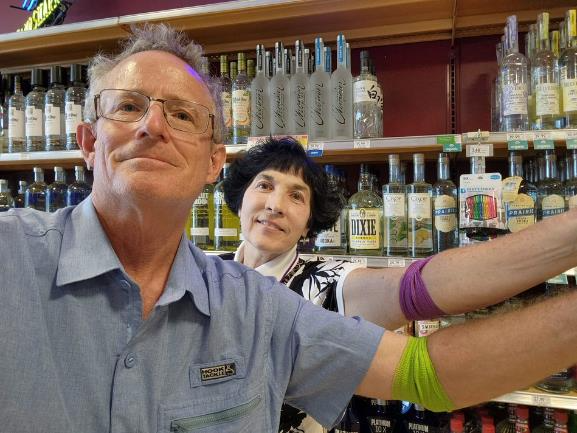 Next week we have all four of our yearly medical appointments and one of them is our annual physical exams so this morning we went to the clinic so they could take blood for our blood tests. That wasn’t much fun, but the nurse gave me a green bandage and Patti a purple one which I noticed were our wedding colors. I got this selfie at the Publix liquor store to commemorate the colors.