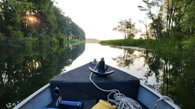 Glen wanted to take his boat out on Lake Moultrie this morning so we got up early and were on the water by 7AM. We put it in at a boat ramp that is on an access waterway. You can see the sun coming up through the trees to the left in this picture as we headed out to the lake.