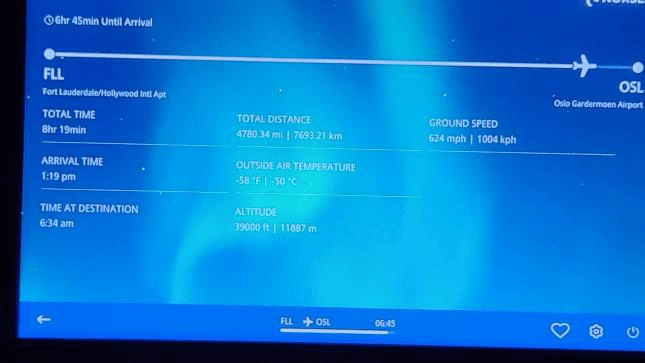 This plane didn’t have the map showing our route, just a data display. In case you wondered, it’s 4,780.34 miles from the Fort Lauderdale airport to the Oslo airport, as the 787 flies.