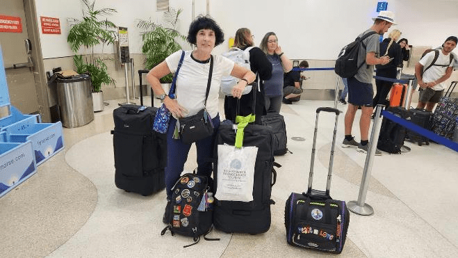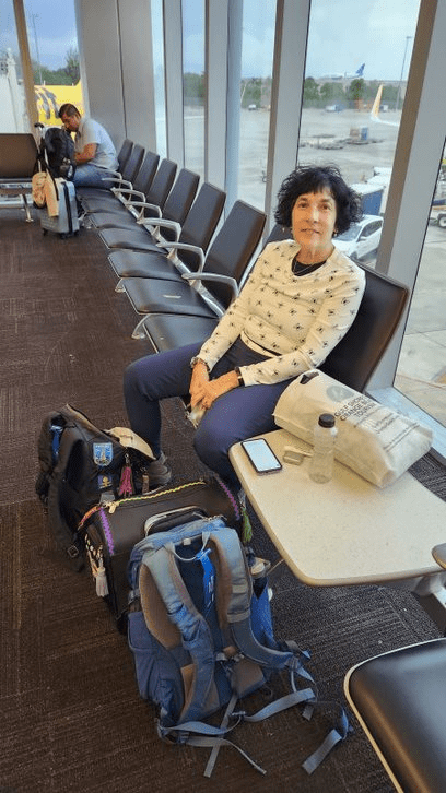Then we went to baggage claim. When our 50-pound (approximately) bags came around on the carousel I let Patti pull them off, she needed the exercise. She’s strong! Notice she’s still wearing her 15-pound backpack in this picture.