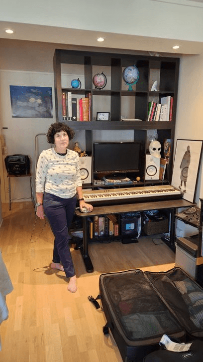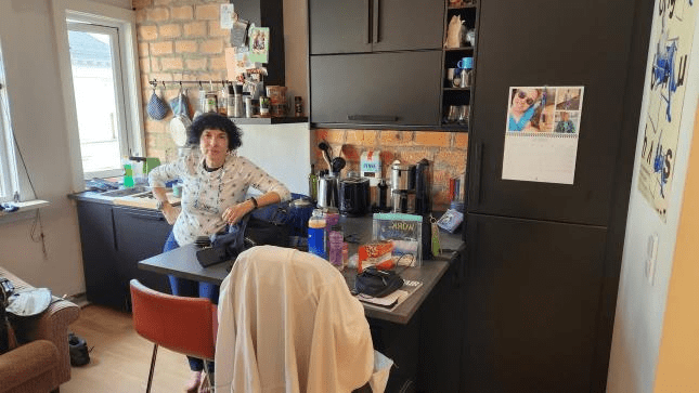 This Airbnb is a studio apartment, here’s Patti in the kitchen with the dining table.