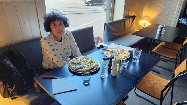 After we unpacked a bit we walked down the street and got pizza at the Laundromat Café. We enjoyed talking to our waiter, he’s a British guy who has lived in Oslo for about 4 years now. Here’s Patti with our pizzas.
