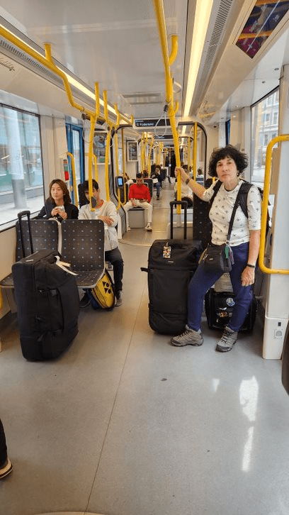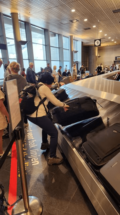 We took the bus from the rental car building to Terminal 4 and got in line for the Norse Atlantic flight to Oslo. Here’s Patti in line. We’re both traveling with our 120-liter Dakine rolling bags and our REI Trail 25 backpacks. Additionally, Patti has a rolling carry-on bag, a purse, a small pillow and blanket, and a water bottle carrier.