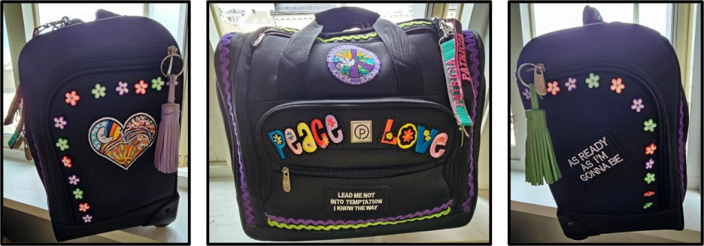 Patti spent countless hours decorating her new rolling carry-on bag. Here’s close-up pictures of her creation.