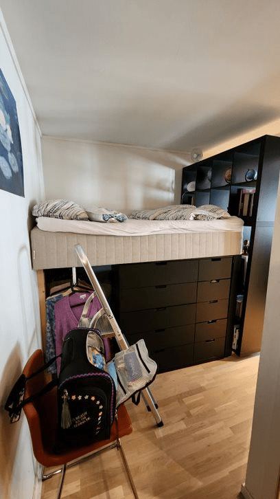 Our loft bed sits on top of the drawers and hanging clothes rack and we have an aluminum step ladder to get into bed. In the middle of the night when I get up to pee, I have to take my time going down the ladder in the dark and half asleep.
