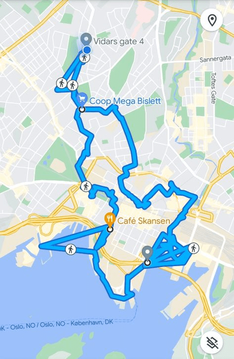 Today we decided to walk down to the opera house and back. When we do this kind of a walk we wander and just basically see what we can see. We knew there would be a lot of interesting things to see. On the map below you can see Vidars Gate 4 which is where we’re living these days. We walked south and made kind of a loop on our walk today. It was about a 10 mile walk.