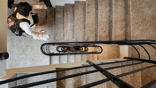 We walked on back home after that, here’s Patti coming up the five flights of stairs in our building. With only our small backpacks it’s not a bad climb.