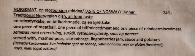 Back home we dried off and got some laptop work done then went to an early dinner at a nearby Norwegian restaurant called Restaurant Schrøder that I had found on Google Maps. They advertised that they have traditional Norwegian food. The hostess and waitress there spoke good English so we had no problems getting a table and ordering our food. I got the “Taste Of Norway” meal.