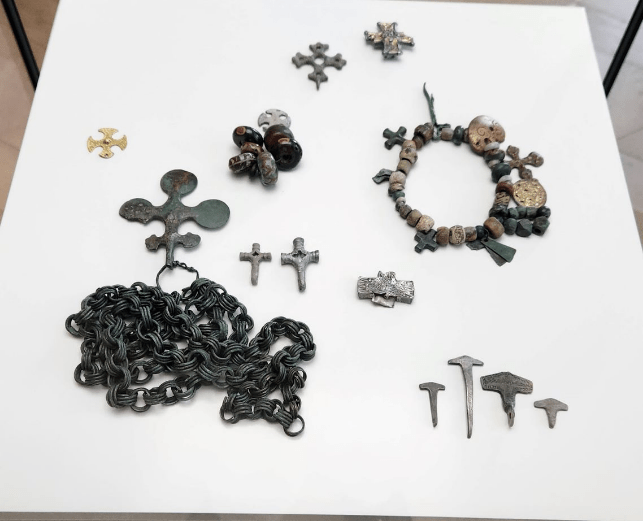 As the Vikings were slowly converted from their worship of Odin, Frigg, Thor, etc. to Christianity the tokens they wore around their necks changed from Thors hammer to crosses. In this glass case you can see the Thor hammers at the lower right, and crosses at the top. Thor’s hammer is called Mjølner, in case you’ve forgotten.