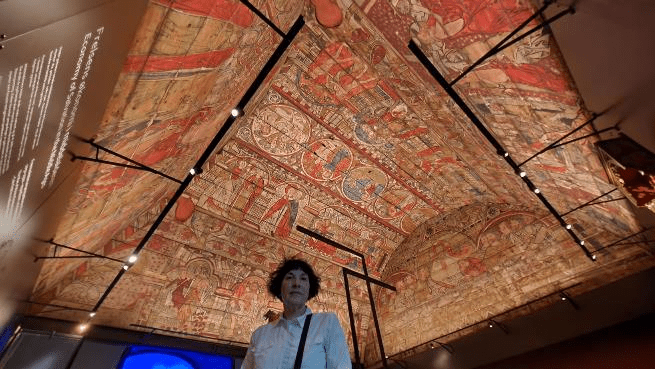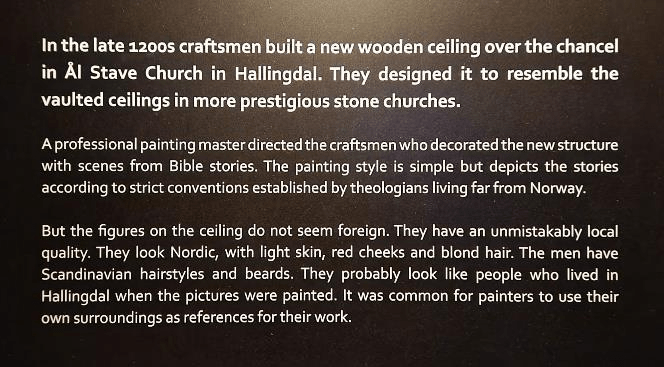 One gallery had the ceiling from a large stave church that was painted with scenes like we’ve seen in the cathedrals in Italy, Portugal, and Spain. The difference is that this church was made of wood and the scenes are painted onto the wooden walls. It’s from the middle ages, around 1300 AD.