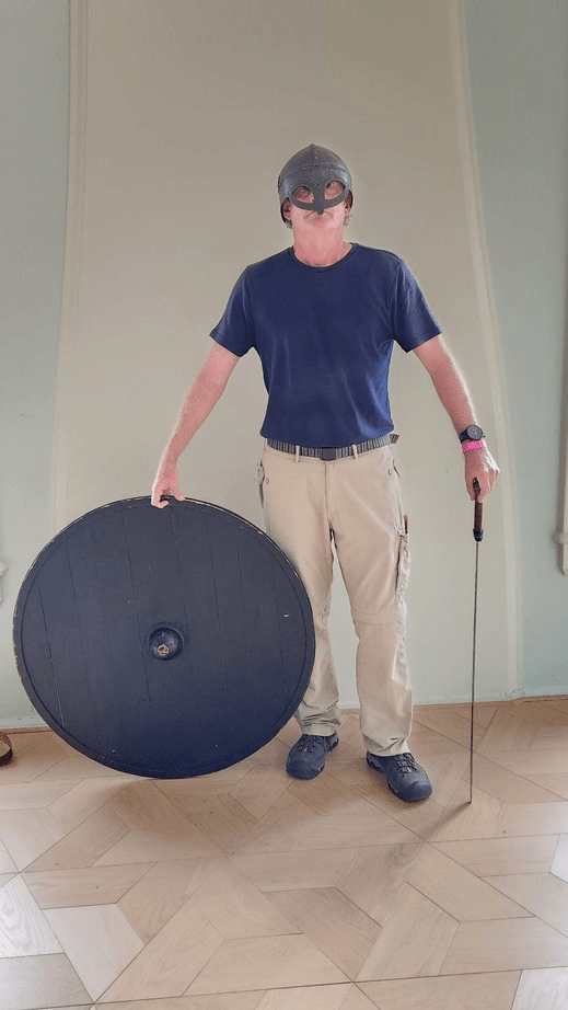 They had a replica Viking helmet, shield, and sword for people to try out. I may have been the oldest one to don the helmet today, by a few decades. But, shoot, I couldn’t help myself.