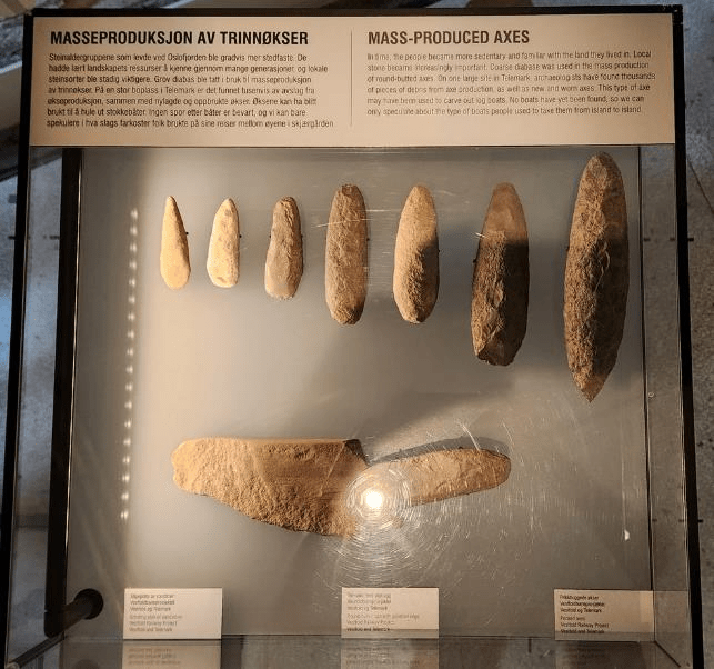 The first gallery had things from the stone age, when people from northern Europe were migrating up into southern Norway as the glaciers receded following the end of the last ice age around 10,000 BC. Here’s some stone axes from those people.