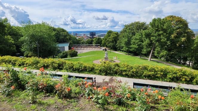 There were lots of people in the park walking their dogs, jogging, and just enjoying the sun when it came out. From the top of the small hill in the middle of the park there was a view of a bit of downtown.