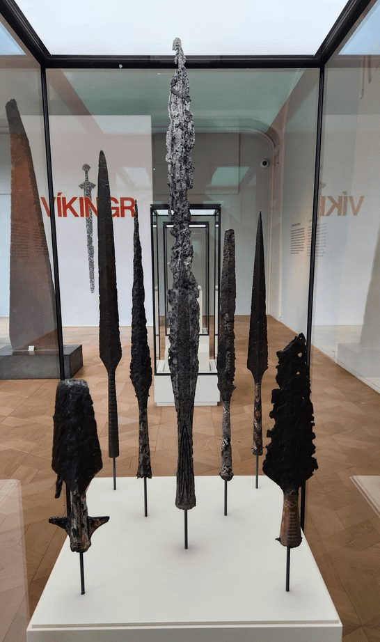 And here’s some spearheads. The spear was one of the Viking warriors’ most important weapons. Most were used for stabbing, only the very lightest ones may have been thrown. The length of the shafts was at least 2 meters so they had a greater stabbing range than swords or axes. Spears were the weapon of choice when armies clashed on the battlefield in their great “shield walls”.