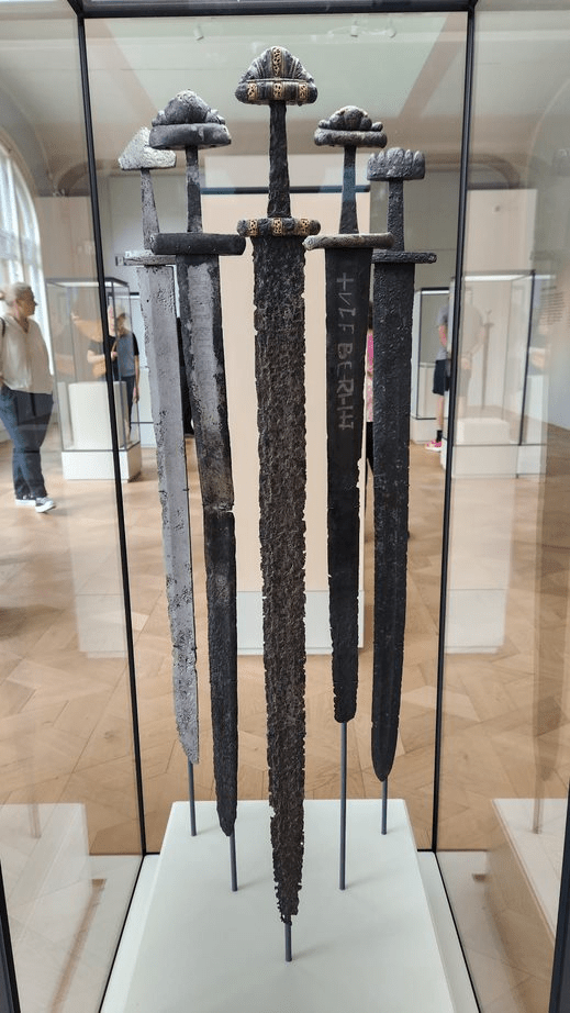Here are some swords, over 3,000 of which have been found in Norway, usually in graves. Swords could vary greatly, some were simple home-forged blades, and some were foreign-made ornate blades with intricate patterns and hilts decorated with precious metals.