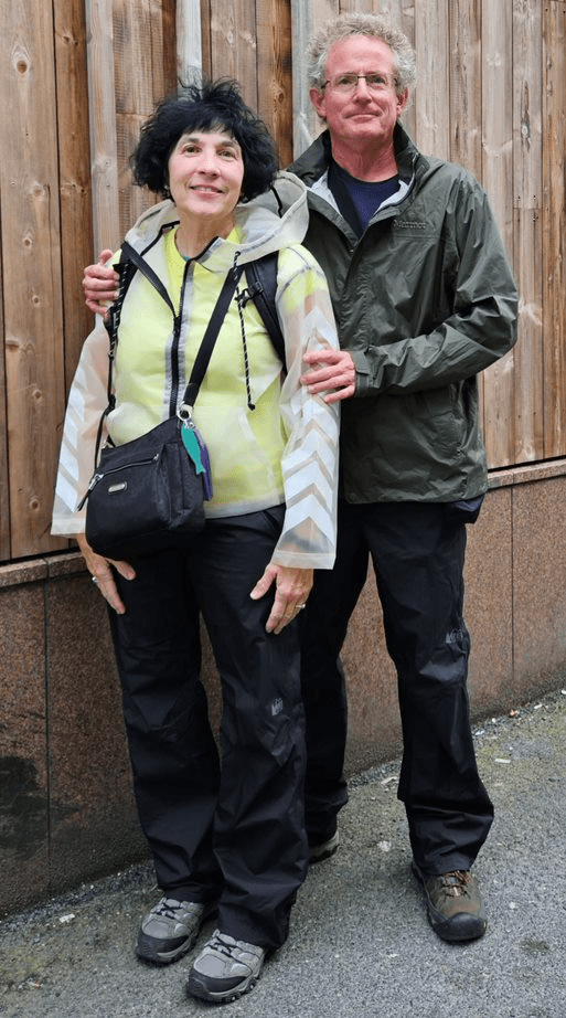 Patti wanted to get a picture of us in our waterproof outerwear which we were testing today so she asked a woman on the sidewalk to take our picture. We both have new pants “shells” that are waterproof that we got at REI during their yearly sale. They fit down over our waterproof hiking boots. Patti has a plastic rain coat and I have a waterproof jacket “shell” made by Marmot. So, rain should run down the outsides of our gear and drip off our boots onto the ground, leaving us dry inside. We’d heard there could be a lot of chilly rain in Norway so we prepared for it as best we could. Of course we also have warm underlayers but we didn’t need them today because it wasn’t that cold.