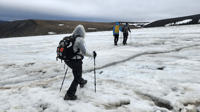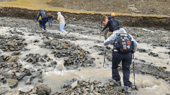 At the edge of the glacier Mareika gave us some pointers on what the footing would be like as we crossed the glacier. We were advised to follow her since it’s possible that unseen ice caves can be underneath and we could possibly fall through a thin ice cave ceiling.