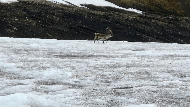 A reindeer trotted across the glacier while we were on it.