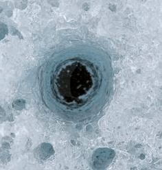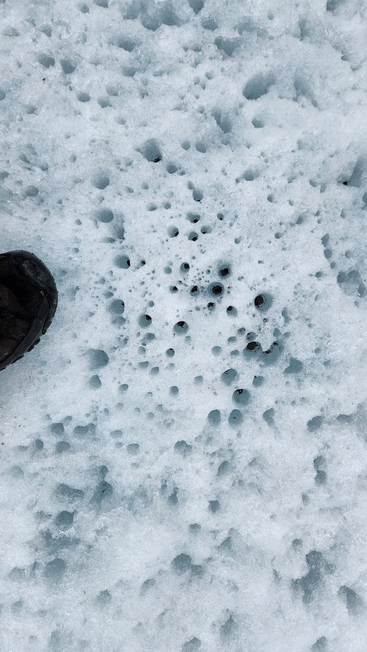 Small stones somehow land on top of the glacier then melt holes down into the ice because they heat up when the sun shines.