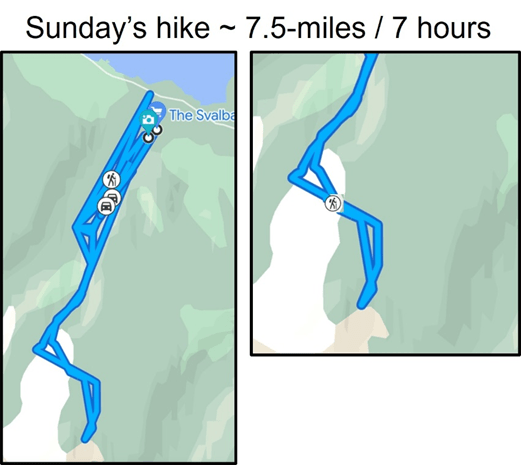 For today’s hike we walked over some streams, up the mountain, across a glacier, then climbed Trollsteinen (Troll Rock). Here’s the Google Maps timeline of the hike.