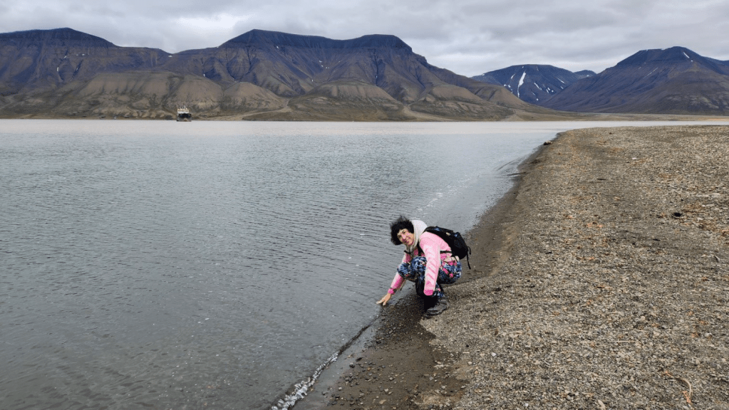 We took it easy this morning, kind of resting up from the past two days of hiking. Then at lunchtime we went out and I got lunch from the hot bar at the Coop grocery store and Patti got a cinnamon roll from a bakery to eat along with a banan. After that we walked down to the water because we were curious about how cold it was. There’s a rocky beach along the fjord at Longyearbyen and we both put our hands in the water. It was, indeed, cold.
