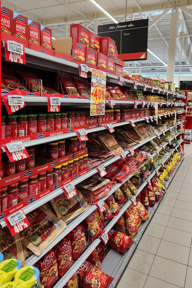 On my first walk today I went by the Eurospar grocery and spent some time meandering around. Tacos seem to be popular in Norway, there is a whole aisle devoted to them.