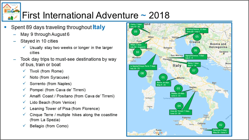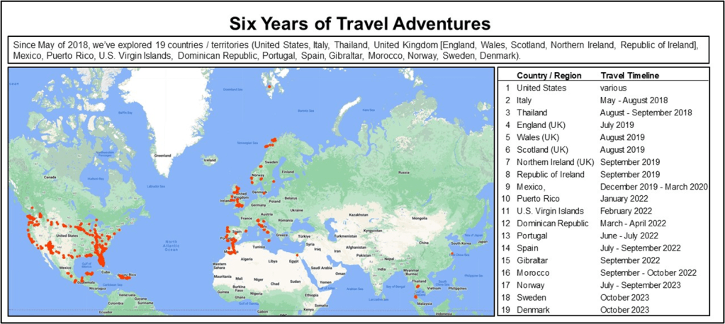 Since May of 2018, we’ve travelled to 19 countries / territories (United States, Italy, Thailand, United Kingdom [England, Wales, Scotland, Northern Ireland], Republic of Ireland, Mexico, Puerto Rico, U.S. Virgin Islands, Dominican Republic, Portugal, Spain, Gibraltar, Morocco, Norway, Sweden and Denmark).