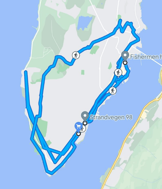 We wandered around town, then went by our Airbnb to drop stuff off, then went for a long walk around the town and the southern half of the island. This is what Google Maps timeline shows for our walk today. I think we went about 10 miles.